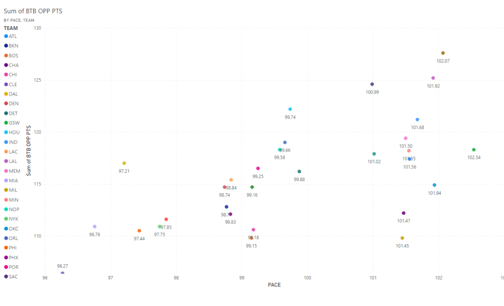 The graph above plots the pace of play on the x-axis and the average points allowed on the y-axis. Due to the amount of teams, I was not able to fit them all into the legend but it is not difficult to see a slight trend that would show the faster a team plays, the more points they tend to give up on the second night of a back to back.