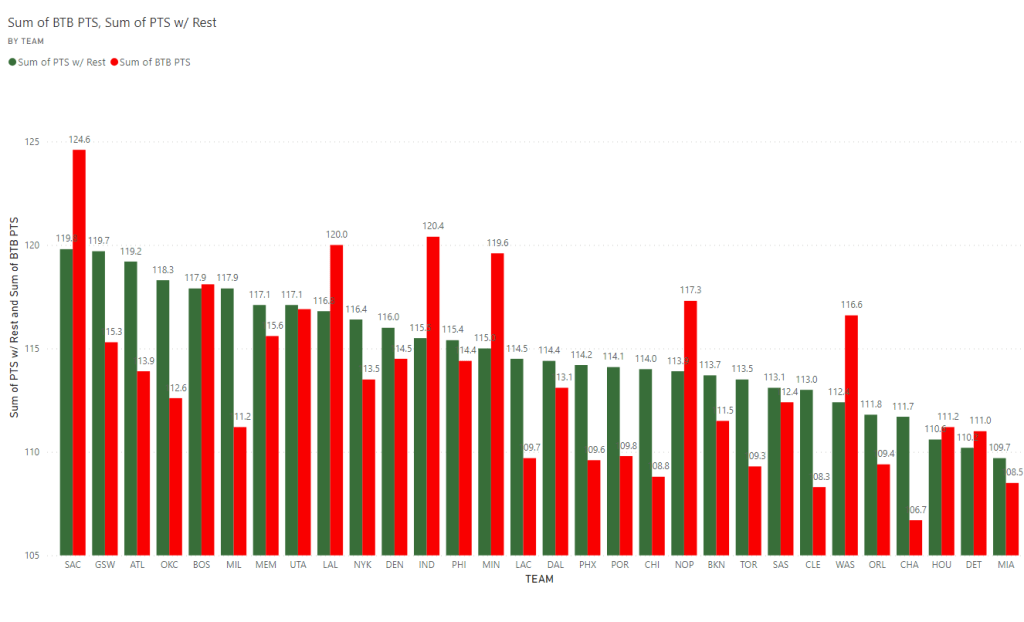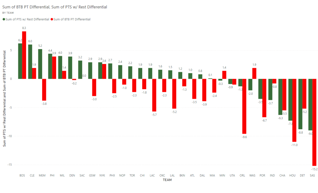The graph above demonstrates this perfectly. The green bars represent the average point differential for a game with rest whereas the red represents the average point differential for a game on a back to back. Take the Toronto Raptors for instance, with rest, they outscore their opponents by 2.2 points per game but on a back to back, that gets flipped and the end up getting outscored by 2.3 points per game.