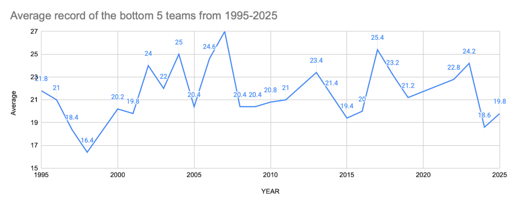 Above is a graph of the average number of wins the bottom 5 teams had each year from 1995-2025. I will agree that we are a little on the low side at the moment but we have been lower so I don’t want to hear any “back in my day”. (Side note: I checked some of the years where the numbers were especially low like 1998 to see if losing coincided with a star player but the #1 overall pick that year was Michael Olowokandi so no, not really). This year the bottom five records are on pace for an average of 21.2 which is kinda average (pun intended).
